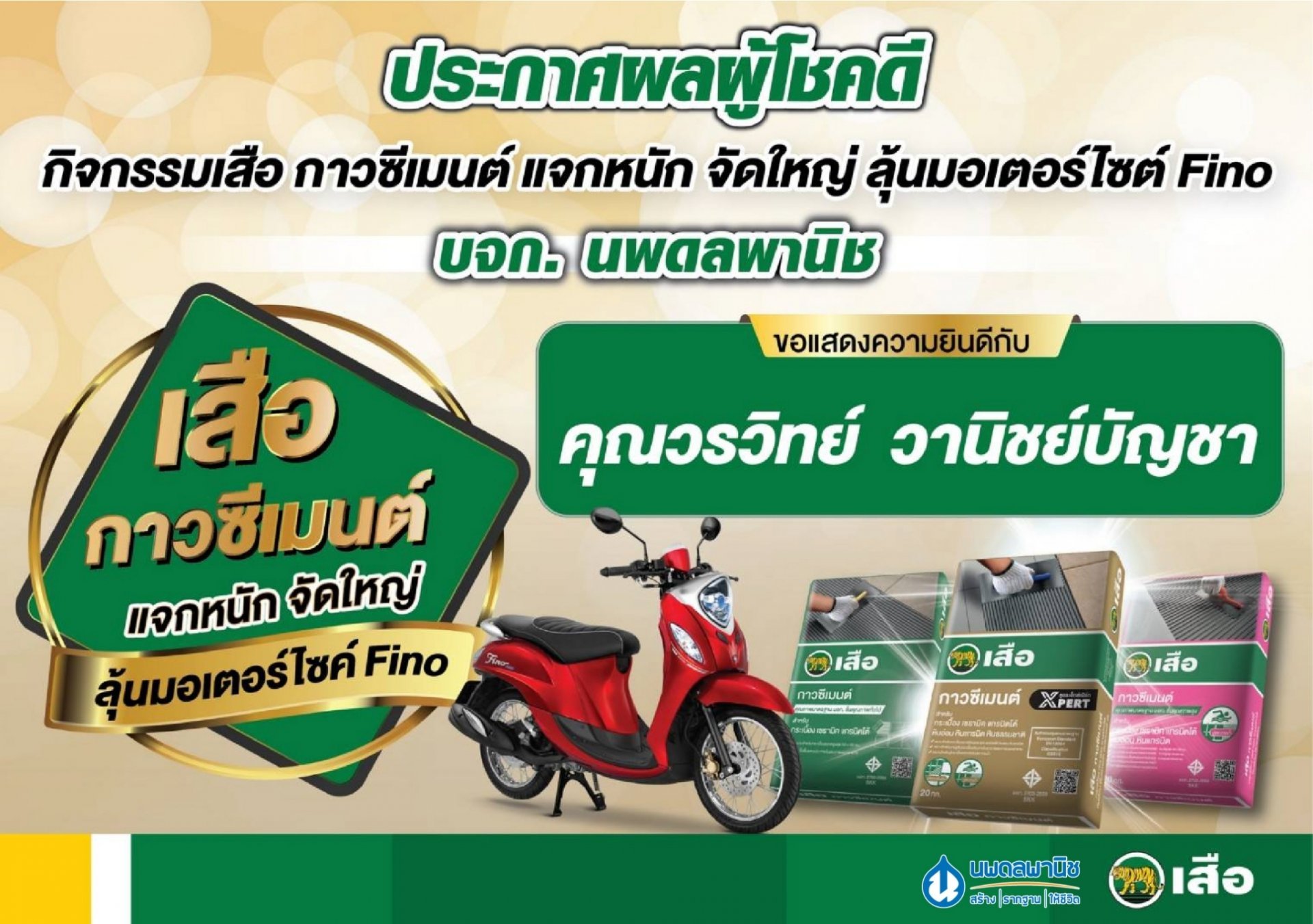ประกาศผลรางวัลผู้โชคดี กิจกรรมเสือ กาวซีเมนต์ แจกหนัก จัดใหญ่ ลุ้นมอเตอร์ไซค์ Fino