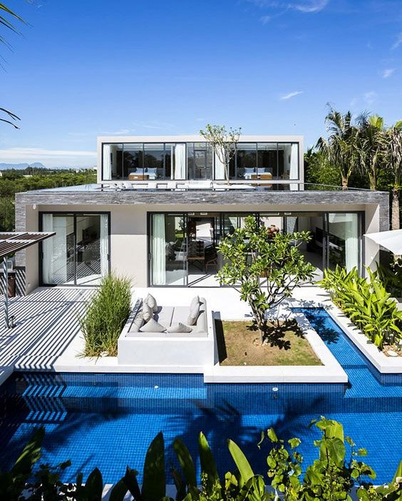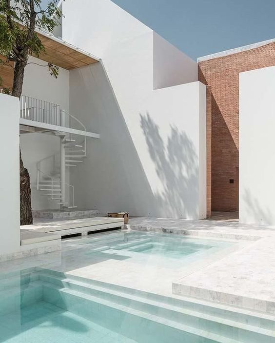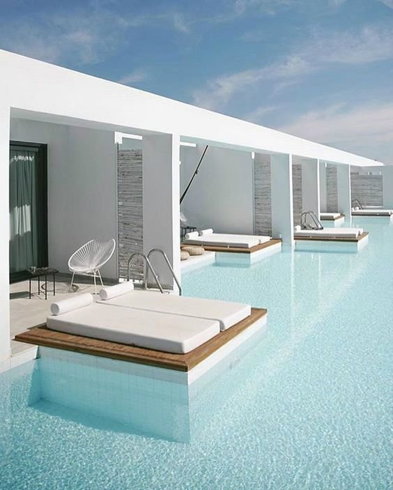 กระเบื้องสระว่ายน้ำโทนสีขาวหรือลายหินอ่อนสีขาว จะมองเห็นสีของน้ำในสระว่ายน้ำที่เป็นสีฟ้าอ่อน ให้อารมณ์ดูกว้างขวาง สะอาด สบายตา