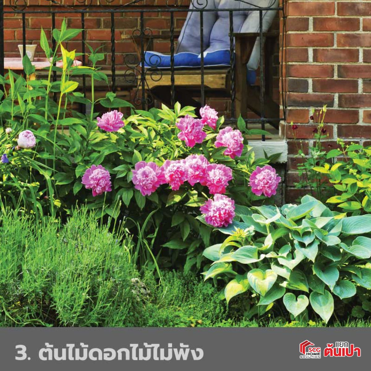 3) ต้นไม้ขนาดเล็ก หรือพุ่มไม้ ดอกไม้บริเวณใต้ชายคา จะได้ไม่โดนน้ำฝนกระแทกอย่างรุนแรงจนหักโค่น