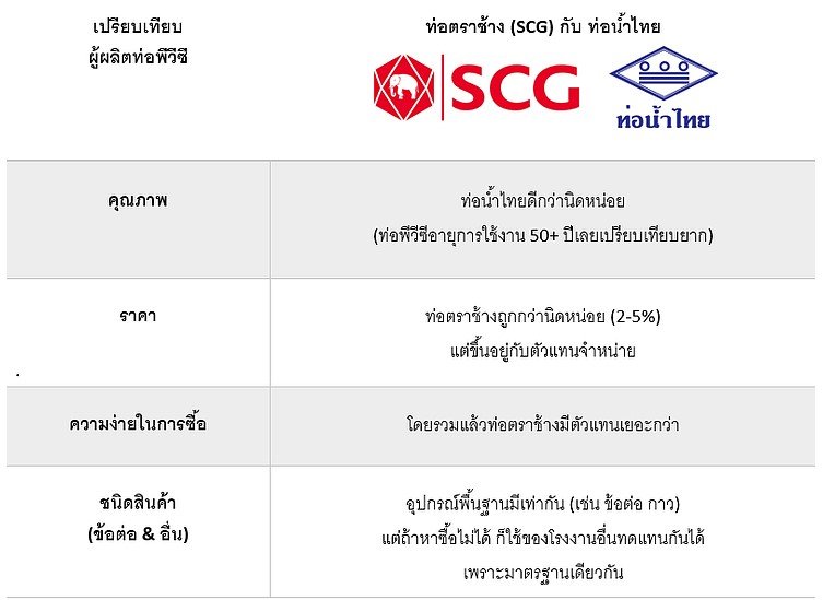 ในฐานะผู้ใช้ ท่อพีวีซีตราช้างจะราคาดีกว่าท่อน้ำไทยนิดหน่อย แต่อย่างไรก็ตามท่อพีวีซีจะมีข้อจำกัดเรื่องการจัดส่งอยู่เยอะ หากคุณไม่ได้ซื้อในจำนวนมากผมคิดว่าซื้ออะไรก็ได้ที่หาง่ายกกว่าก็พอครับ หากคุณซื้อในจำนวน 5000 ถึง 10,000 บาทขึ้นไป ค่อยหาวิธีลดต้นทุนด้วยการหาตัวแทนจำหน่ายอีกที
